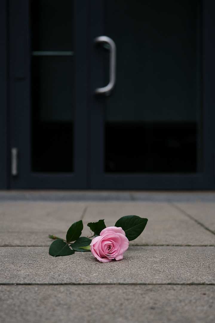 Roses Revolution 2025 - Symbolbild Rose vor Klinik, stiller Protest gegen Gewalt in der Geburtshilfe